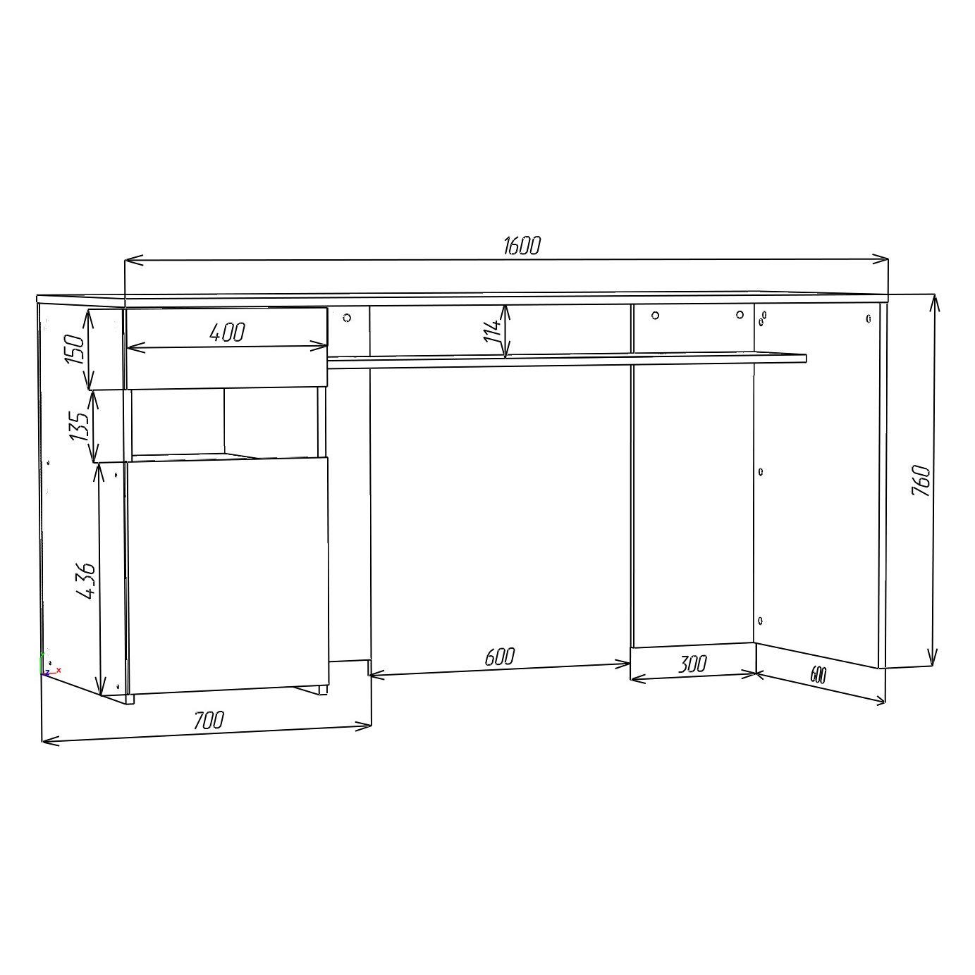 - Розміри (Ш×Г×В): 1600×600×760 мм